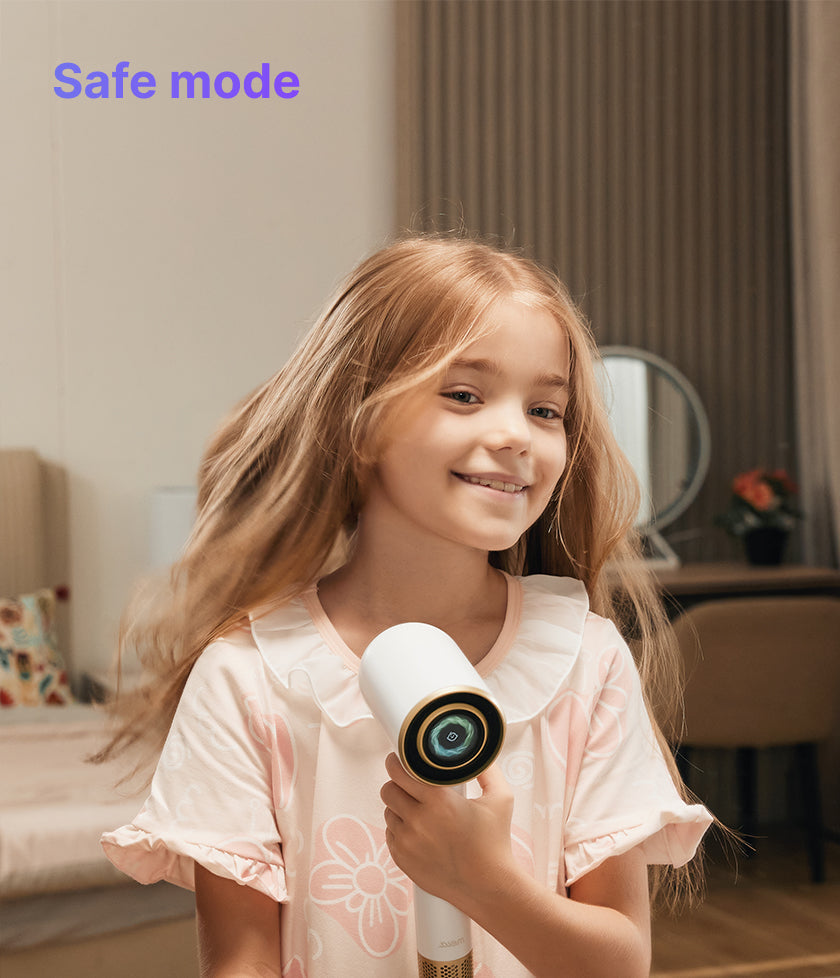 - Lower heat and airflow with one button – gentle for kids and sensitive skin.