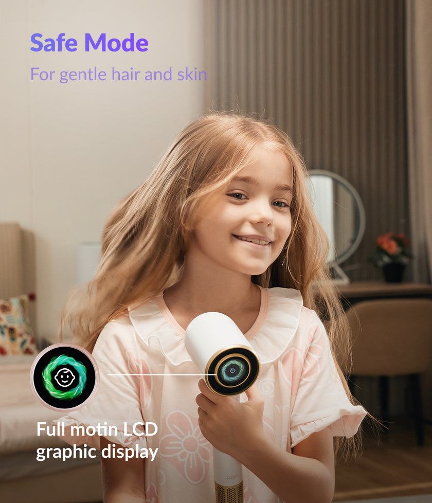 - Safe Mode : one button features lower speed and temperature for gentle hair and skin