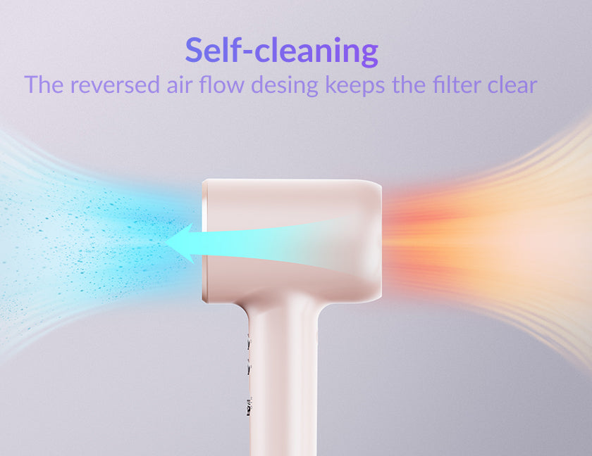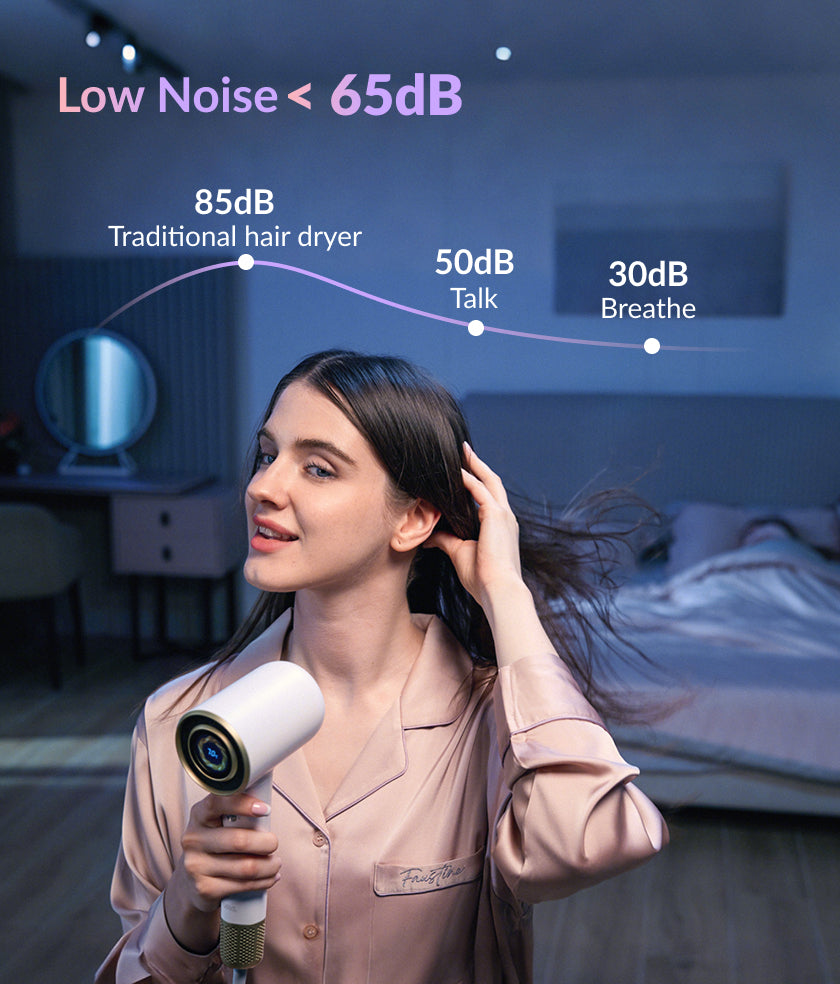 Mera's unique patented air channel design technology can increase wind power while avoiding hair entanglement. 110K RPM High Speed Motor, Max Air Speed 152mph, dries hair up to 50% faster than at raditional hair dryer*(In lab testing vs. 1800W non-ionic hair dryer).